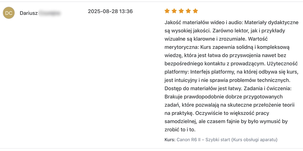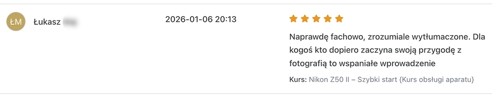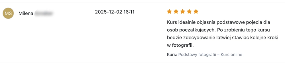 „Fotografuję od 2 lat, brakowało mi uporządkowania ekspozycji i światła. Po kursie przestałem strzelać na chybił trafił i wiem, dlaczego ustawiam dane parametry”